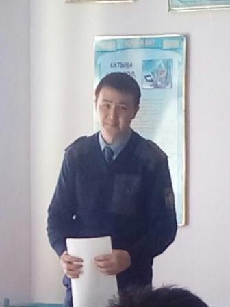 Үшінші мәселе бойынша мектептің учаскелік полиция инспекторы полиция лейтенанты Б.Жабасбаев сөзінде Шу аудандық ЖПҚ ЮПБ-де есепте тұрған оқушы жоқ. Кәмнлеттік жасқа толмағандар арасында құқық бұзушылық пен заң бұзушылықтың алдын алу мақсатында мектептің оқушылары арасында түсіндірме жұмыстары (лекция, семинар) өткізілді. Сонымен қатар, мектепте 2 бала бір жайсыз отбасынан тізімге алынған. Олардыңтұрмыстық жағдайын анықтауда тұрғанүйлеріне рейд жүргізіліп, үнемі бақылауға алынғанын айтып өтті.