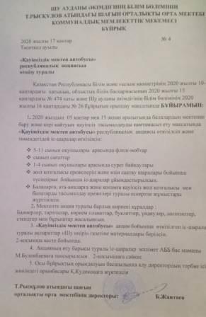 «Қауіпсіз мектеп автобусы» республикалық акция аясында, Тасөткел ауылы Т.Рысқұлов атындағы шағын орталықты орта мектебінде 12 қаңтар- 15 ақпанаралығына іс-шаралар жоспарын өткізу туралы бұйрық шығарылып, директордың тәрбие ісі жөніндегі орынбасары Кудекова Қарлығаш Джумабековна «Қауіпсіз мектеп автобусы» аттыакциясының іс-шаралар жоспарымен таныстырды.